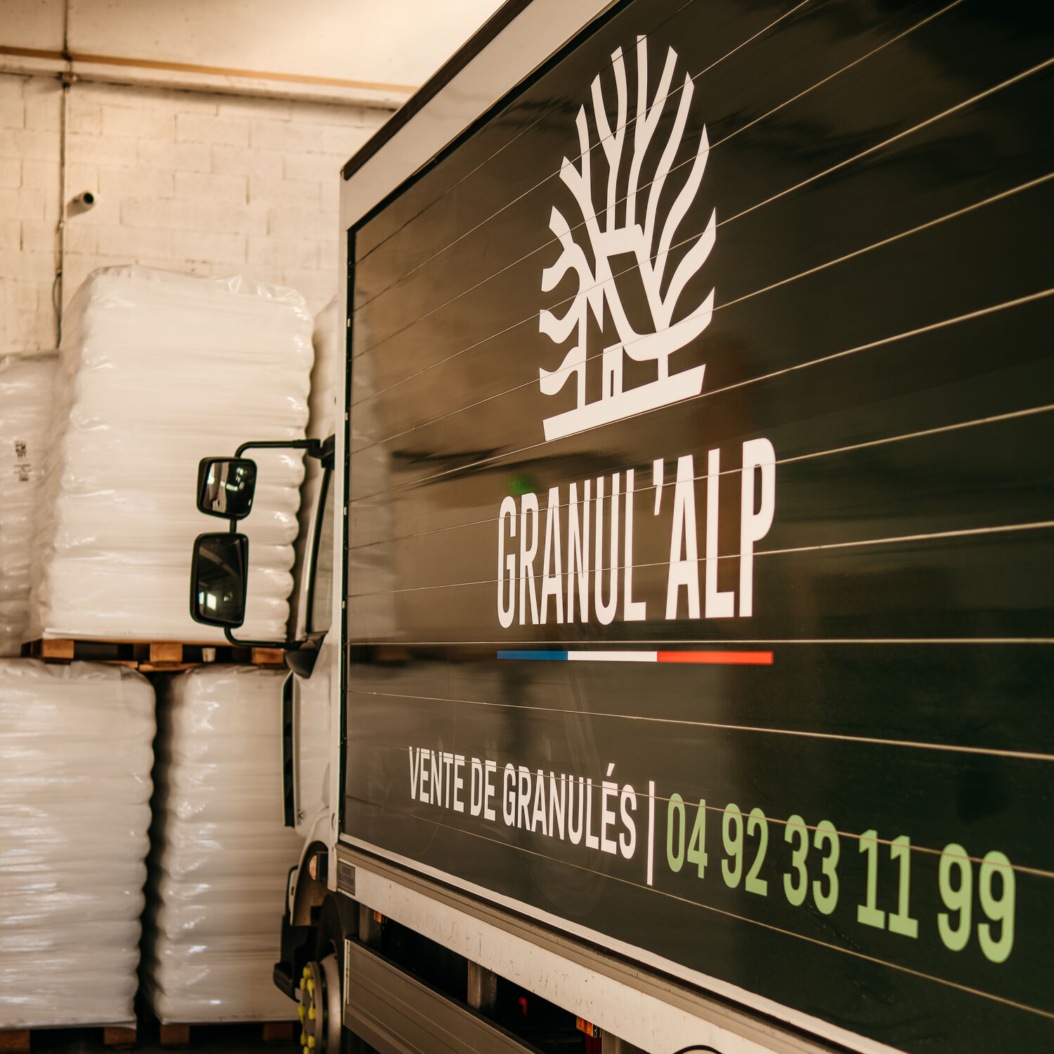 L'équipe est équipée d'un camion de livraison à l'image de Granul'Alp.